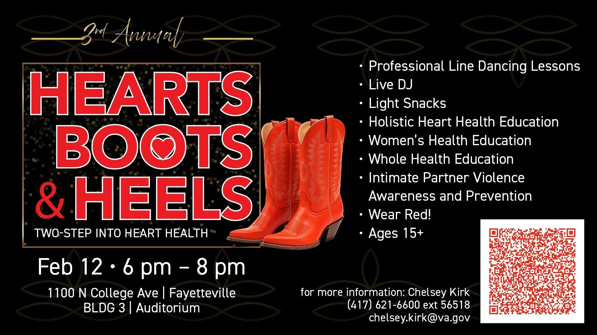 Back to All Events 3rd Annual Hearts, Boots, and Heels Thursday, February 12, 2026 6:00 PM 8:00 PM BLDG 3 - Auditorium 1100 North College Avenue Fayetteville, AR, 72703 United States (map) Google Calendar ICS
